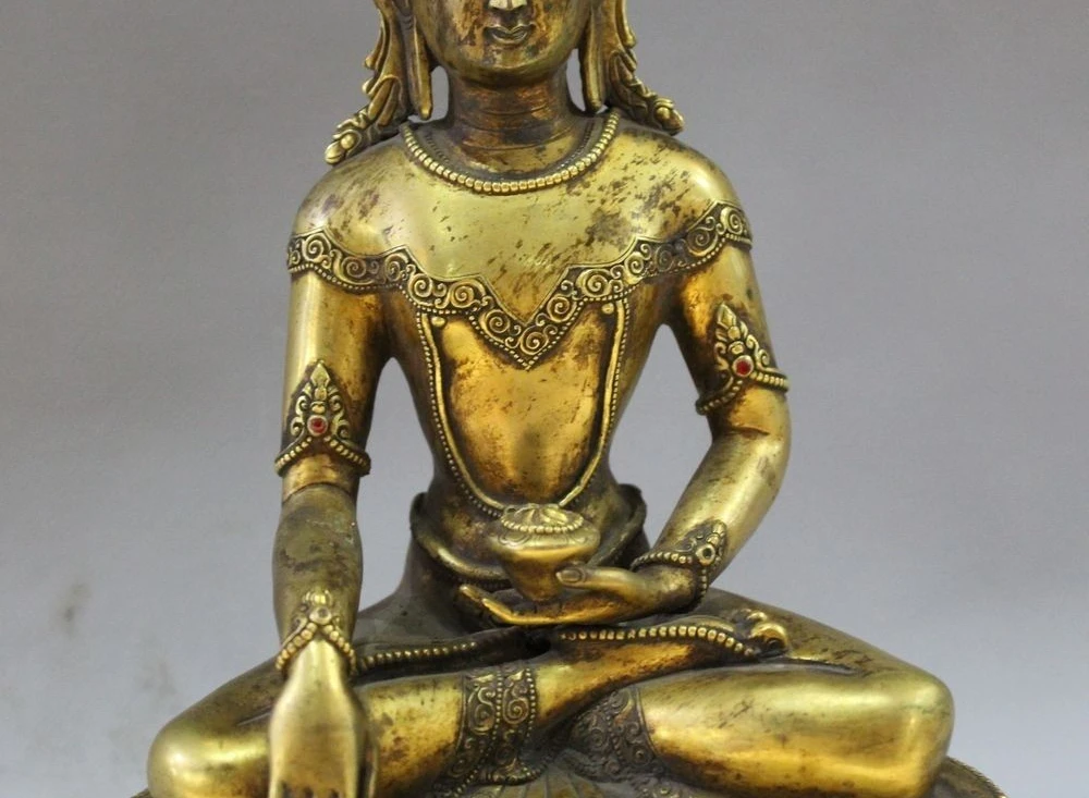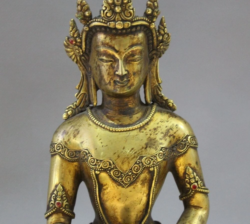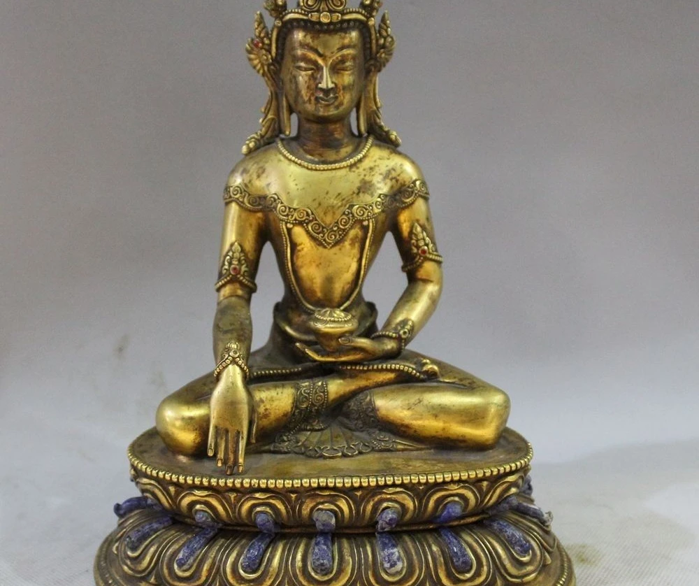 9"Tibet Buddhism Temple Bronze 24K Gold Gem Stone Amitayus Buddha Statue