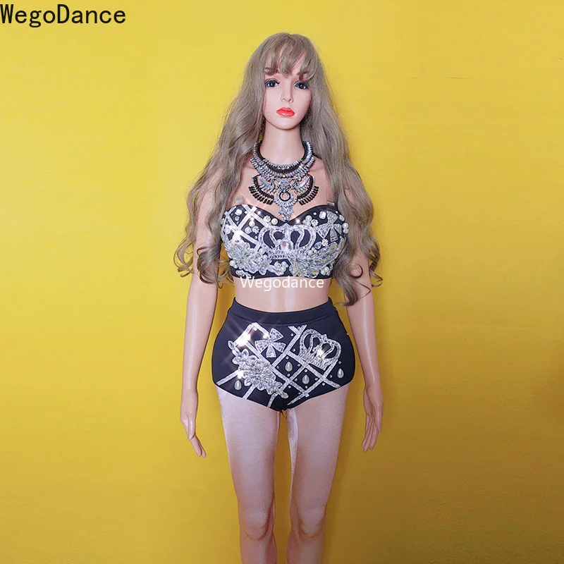 BEST QUALITY Hot Sale Sparkly Crystals Black Bikini Outfit Bras Short 3 pieces Set Necklace Costume Singer Stage